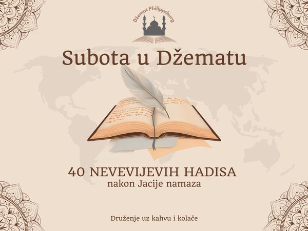 Nakon zajednički obavljenog namaza, pristupit ćemo čitanju kapitalnog hadiskog djela "ČETRDESET NEVEVIJEVIH HADISA".