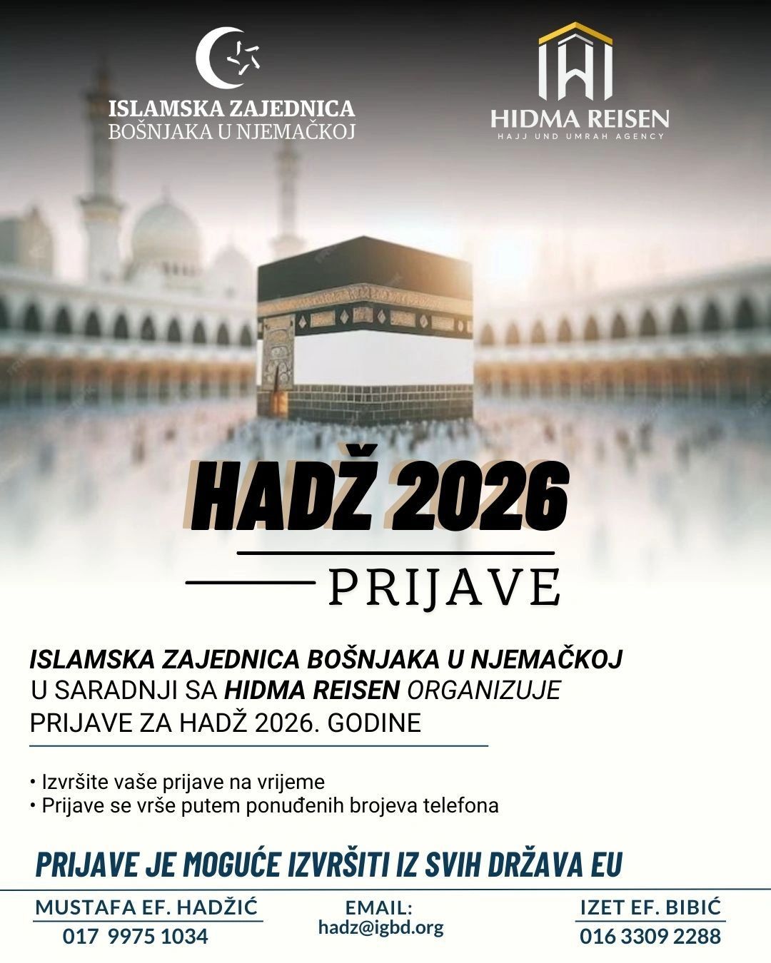Želimo vas obavijestiti da je Ministarstvo za hadž Kraljevine Saudijske Arabije jedini zvanični organizator hadža, dok Islamska zajednica Bošnjaka u Njemačkoj, u saradnji sa Hidma Reisen, djeluje isključivo kao servis džematlijama – s ciljem olakšavanja prijave i izvršavanja ove islamske dužnosti.